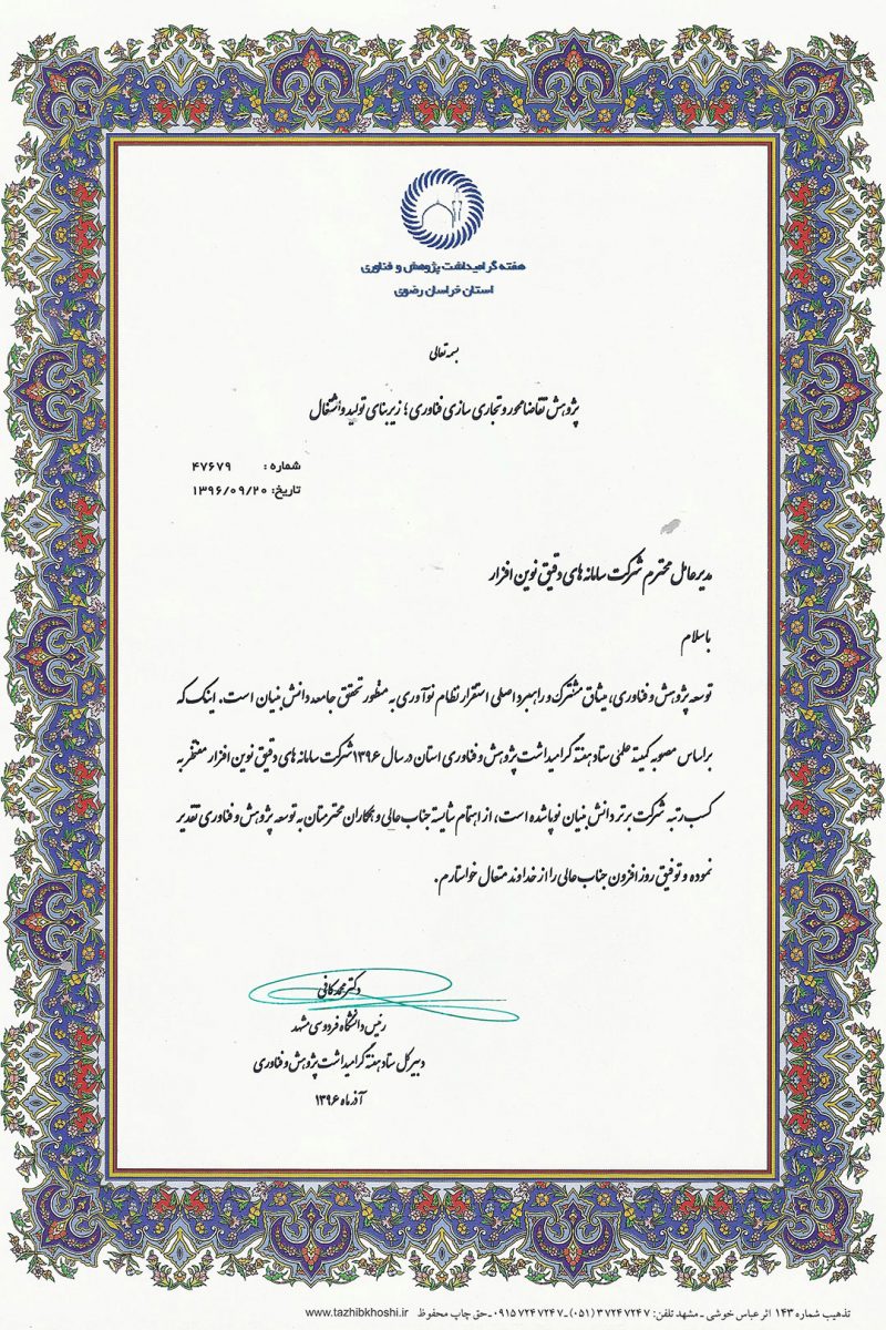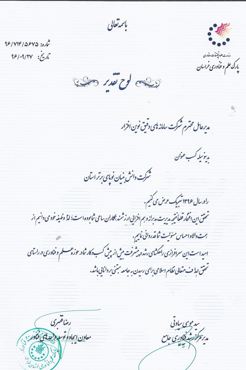 شرکت سامانه های دقیق نوین افراز دارای سیستم مدیریت تضمین کیفیت ISO 9001:2008 از TUV-ICB می باشد. با تلاش و پیگیری متخصصین شرکت درجهت تولید علم و بومی سازی دانش فنی روز دنیا موفق به کسب عنوان دانش بنیان از معاونت علم وفن اوری ریاست جمهوری گردید. واحد تحقیق و توسعه این شرکت نیز در محل پارک علم وفن آوری خراسان رضوی مستقر می باشد .