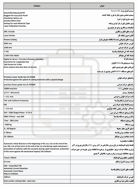 جدول مشخصات دستگاه برش CNC فلزات مدل موهاوی